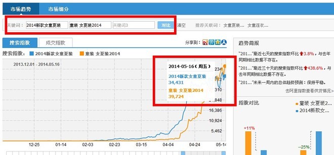 如下图:我们返回淘宝指数的首页,把这两个关键词分别输入进行对比,我们发现2014新款女童夏装比童装 女夏装2014的搜索指数要高5000多点,可能大家觉得,那我就选搜索指数高的把,别再着急,我们的目的是要找出性价比最高的对应关键词,下一步才是关键!